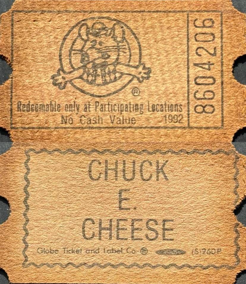 Back Text: CHUCK E. CHEESE, Globe Ticket and Label Co.