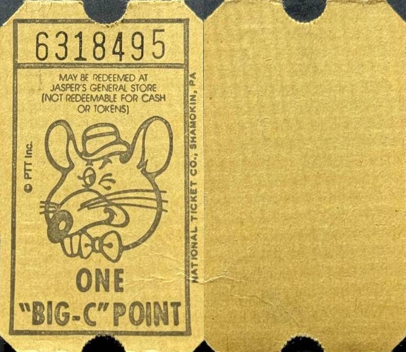 Front Text: May be redeemed at Jasper's General Store (Not redeemable for cash or tokens), ONE "BIG - C" POINT