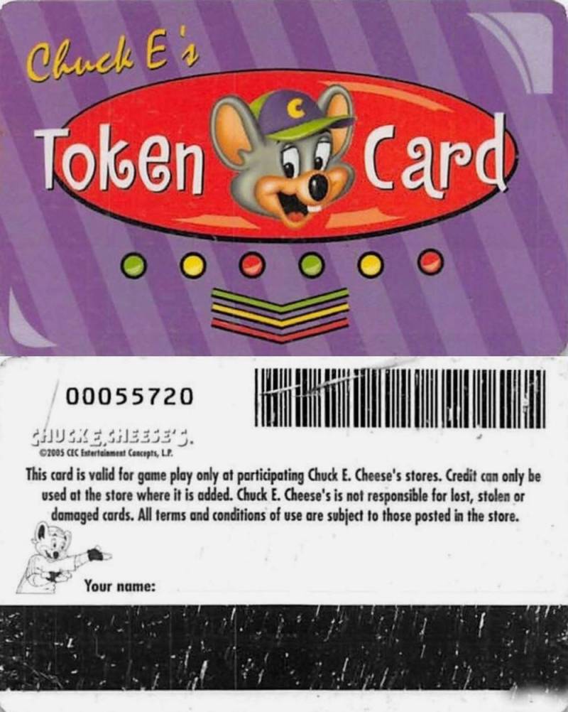 Chuck E.'s Play Pass is a card that is the current form of currency at most Chuck E. Cheese's. It replaced tokens and tickets as the main form of gameplay currency in those locations. You can get this card as either an All You Can Play card in white, or a standard one, which is usually blue. There is an alternative to this, known as Chuck E.'s Play Band.