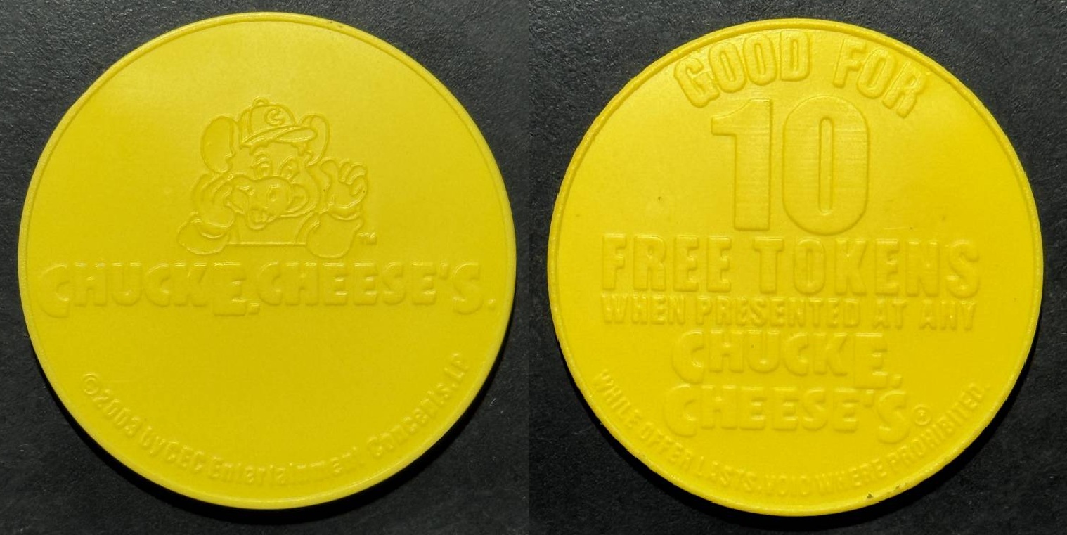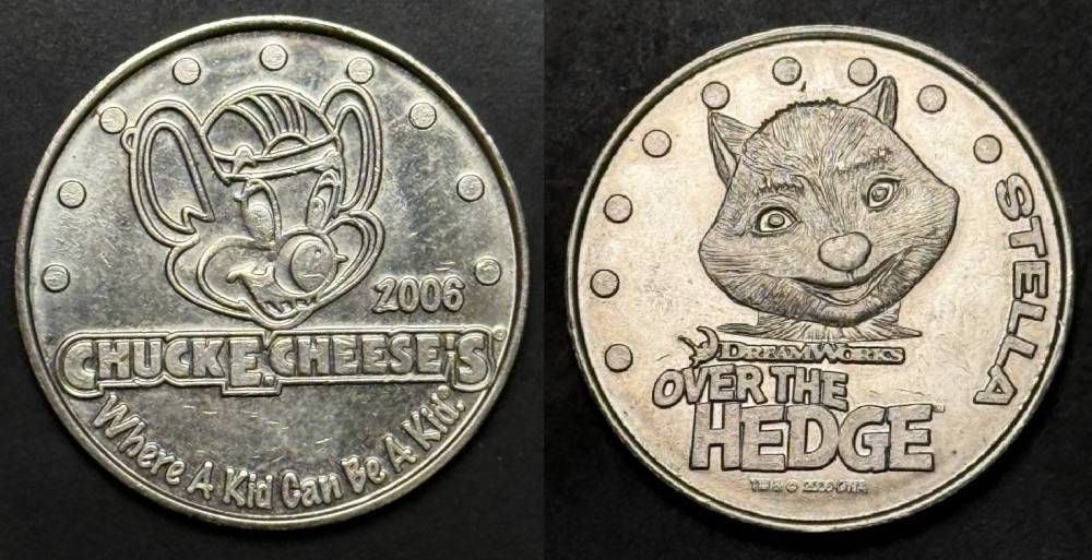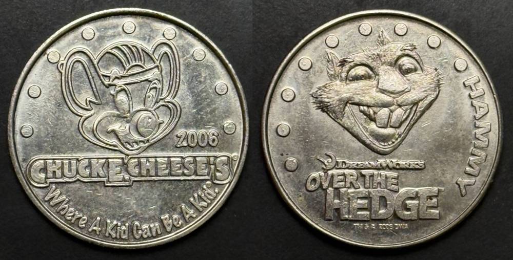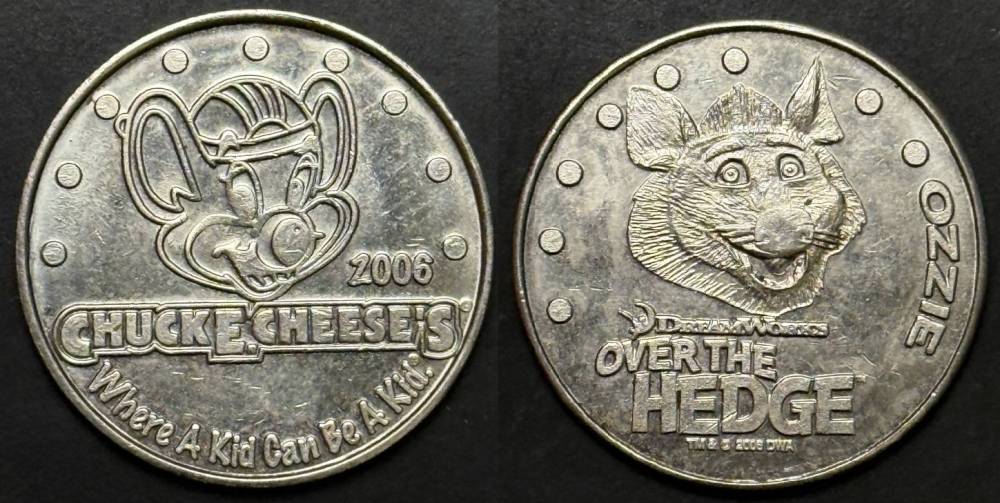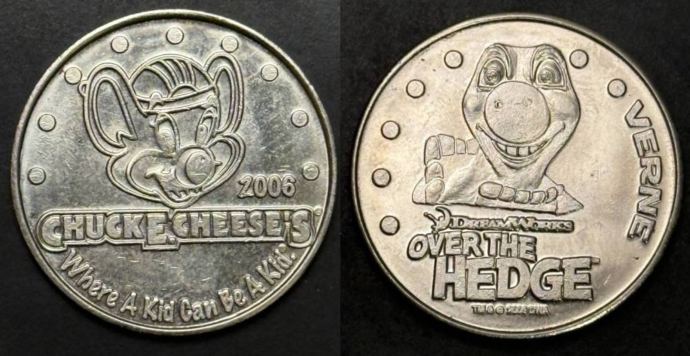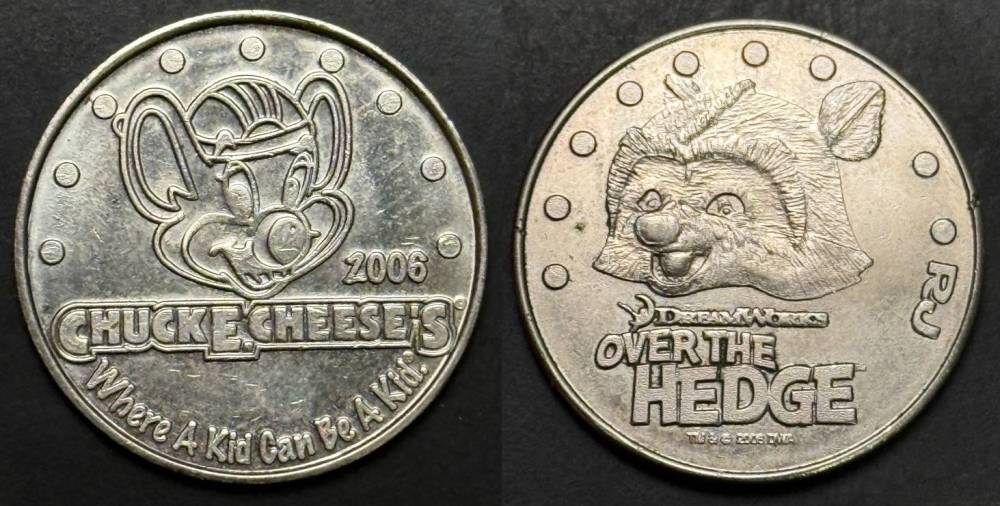 The last group of Chuck E. Cheese tokens includes promotional tokens given out to advertise the restaurant. These could be used to redeem a certain amount of game tokens (sometimes requiring a specific food purchase.) Also included in the promotional tokens are the 2006 tokens advertising the movie, "Over the Hedge." These tokens were intended to be used by guests in the arcade games during their visit.