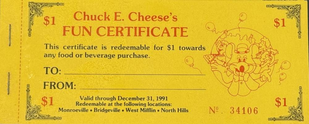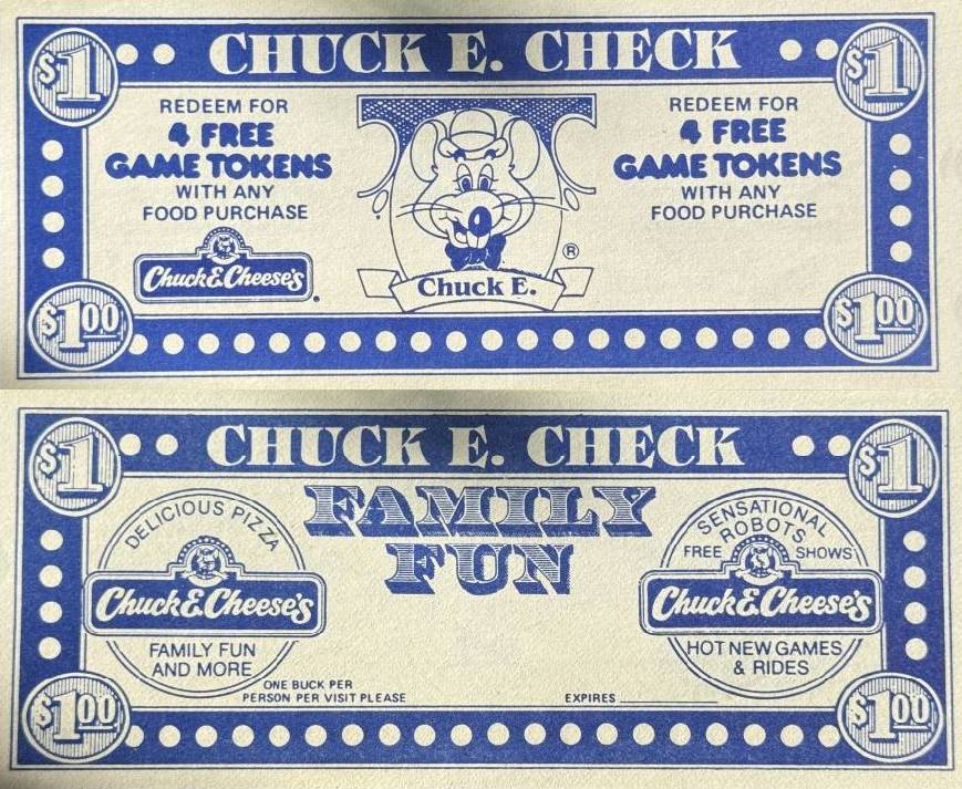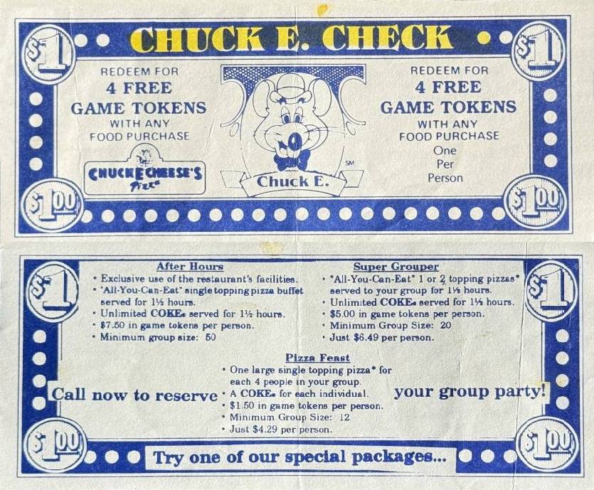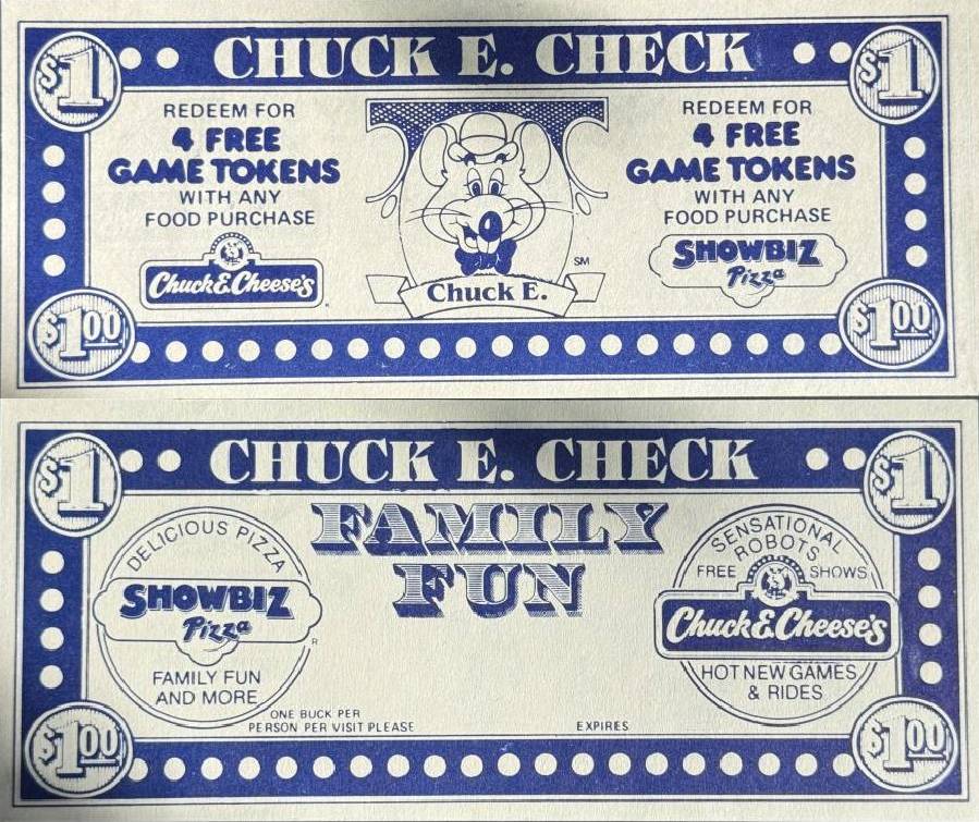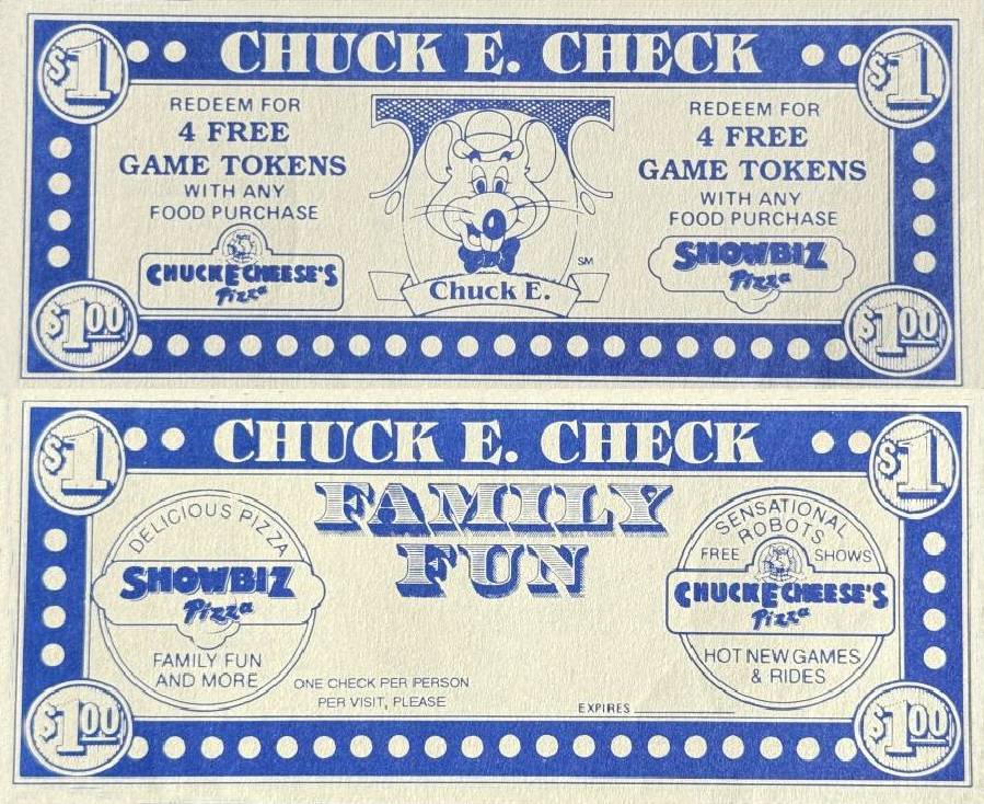 Front Text: Chuck E. Check, Redeem for 4 free game tokens with any food purchase, Chuck E Cheese's Pizza, Redeem for 4 free game tokens with any food purchase, Showbiz Pizza