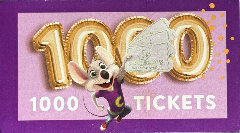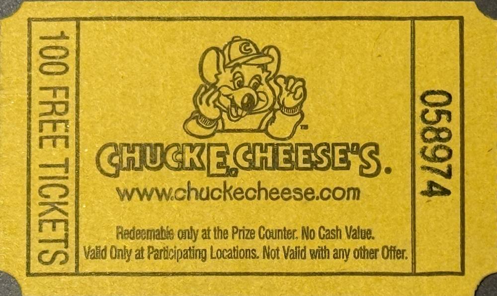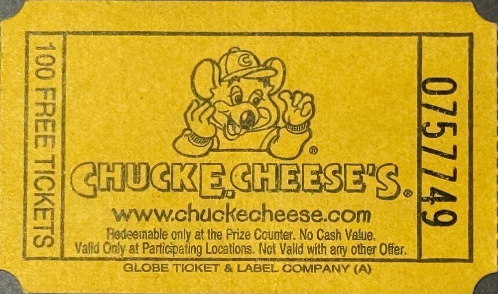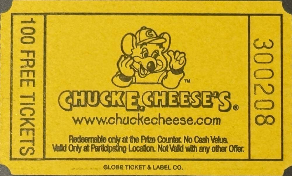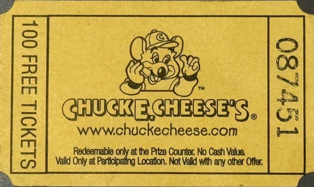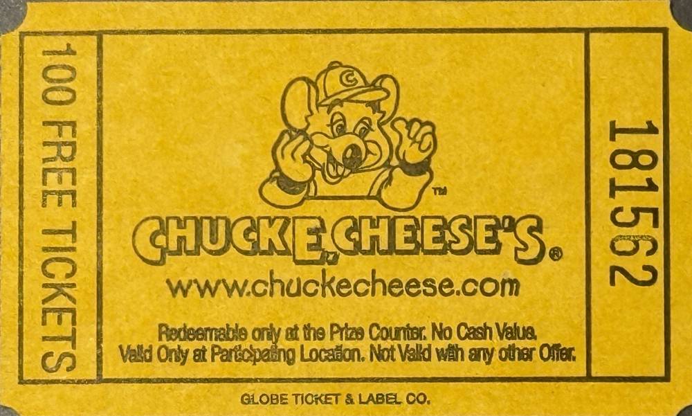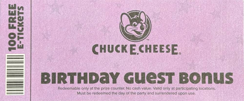 Front Text: 100 Free E-Tickets, Chuck E cheese Birthday Guest Bonus. Redeemable at the prize counter. No cash value, Valid at participating locations. Must be redeemed the day of the party and surrendered upon use.