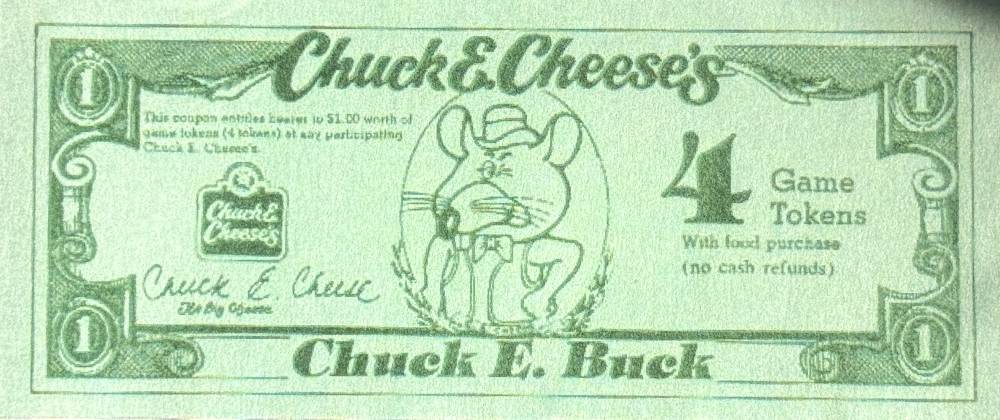 Front Text: Chuck E Cheese's, Chuck E. Buck, This coupon entitles bearer to $1.00 worth of game tokens (4 tokens) at any participating Chuck E Cheese's, 4 Game Tokens with food purchase, No Cash Refunds.