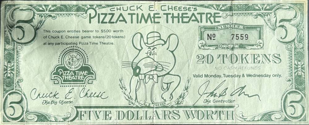 Front Text: Chuck E Cheese's, Pizza Time Theater, This coupon entitles bearer t0 $5.00 worth of Chuck E Cheese Game tokens (20 Tokens) at any participating Pizza Time Theater, 20 Tokens, No Cash Refunds, Valid Monday, Tuesday and Wednesday Only. Five Dollars Worth.