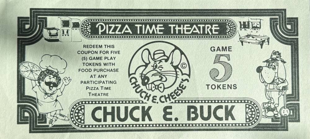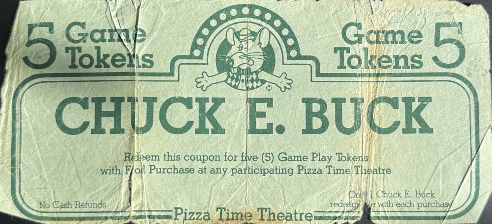 Front Text: Chuck E. Buck, Redeem this coupon for five (5) Game Play Tokens with food purchase at any participating Pizza Time Theatre, 5 Game Tokens, No Cash Refund, Only 1 Chuck E. Buck redeemable with each purchase