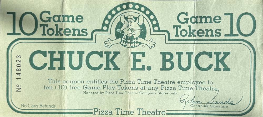 Front Text: Chuck E. Buck, This coupon entitles the Pizza Time Theater employee to ten (10) free Game Play Tokens at any Pizza Time Theater. Honored by Pizza Time Theater Company Store only, No cash refunds, Controller signature.