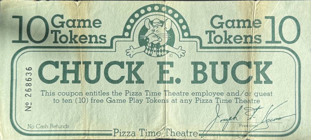 Front Text: Chuck E. Buck, This coupon entitles the Pizza Time Theater employee to ten (10) free Game Play Tokens at any Pizza Time Theater. Honored by Pizza Time Theater Company Store only, No cash refunds, President signature.