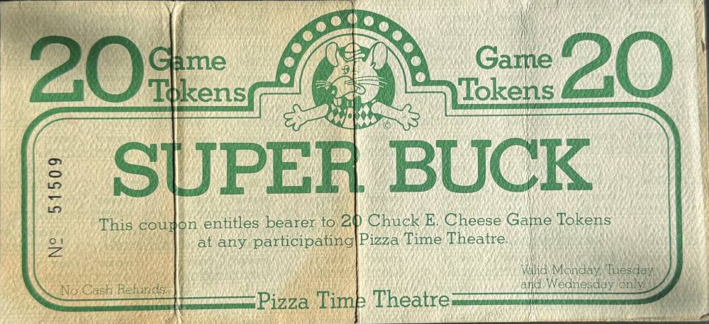 Front Text: Pizza Time Theatre, Super Buck, 20 Game Tokens, This coupon entitles the bearer to 20 Chuck E. Cheese Game Tokens, at any participating Pizza Time Theatre, Valid Monday, Tuesday, and Wednesday only, No Cash Refunds