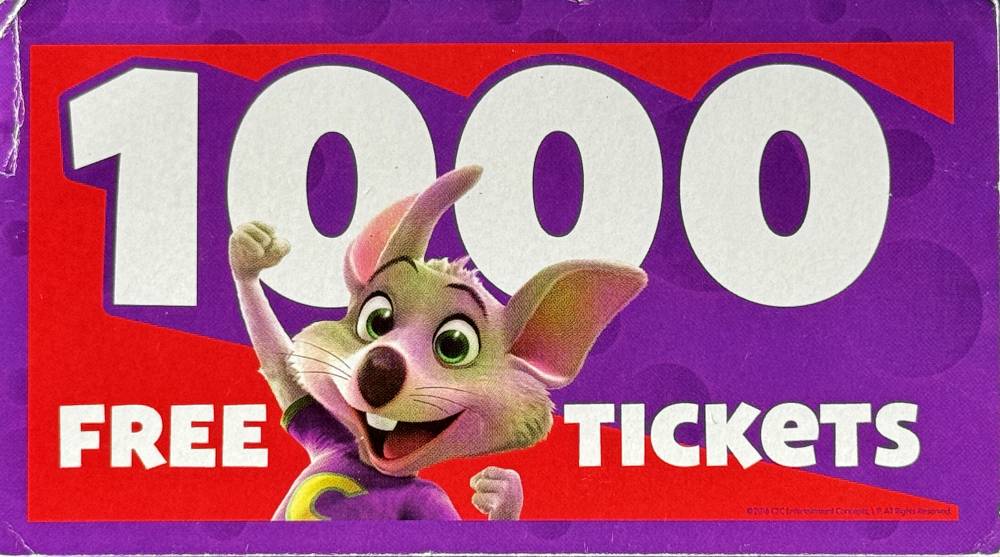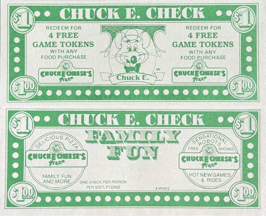 Front Text: Chuck E. Check, Redeem for 4 free game tokens with any food purchase, Chuck E Cheese's Pizza, Redeem for 4 free game tokens with any food purchase, One per Person