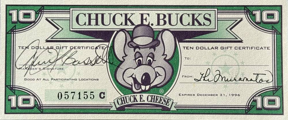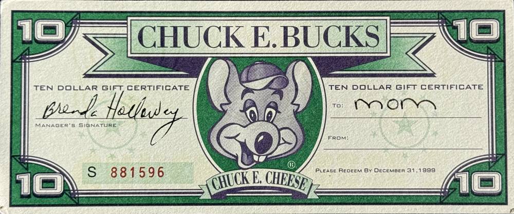 Front Text: Chuck E. Bucks, Chuck E Cheese, Ten Dollar Gift Certificate, Managers Signature, Good at All Participating Locations, To:, From:, Expires December 31, 1996