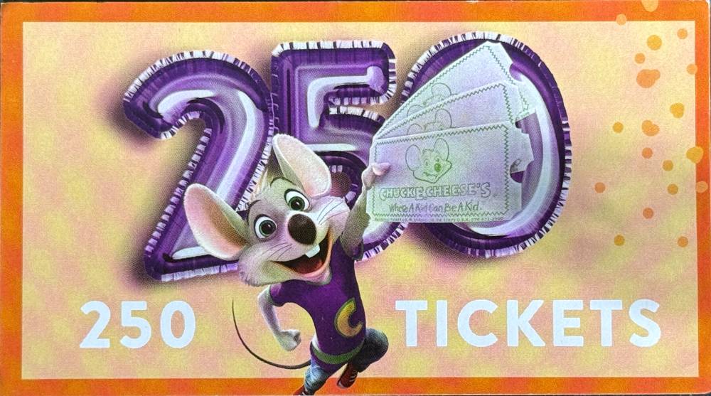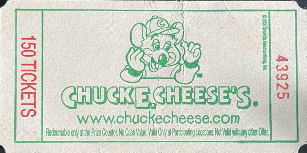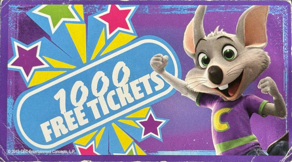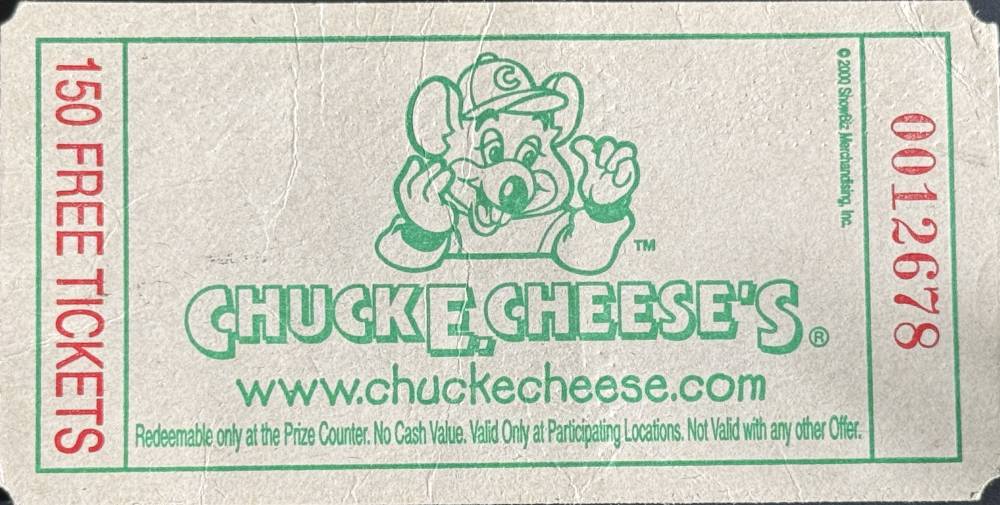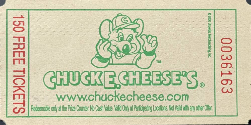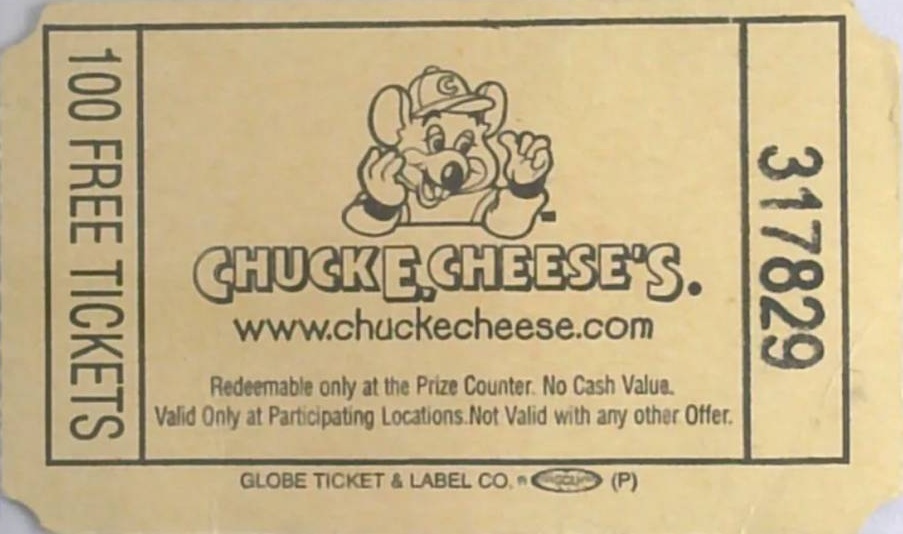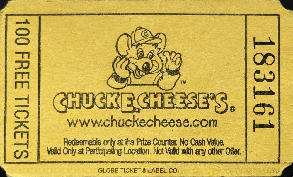 Some tickets are promotional in nature. These tickets are not earned from a game, but rather handed out at special events, schools, or to people participating in a special CEC promotional activity. The promotional tickets listed here are used to redeem tokens (sometimes requiring a certain food purchase) or represent multiple tickets. Coupons are not listed.