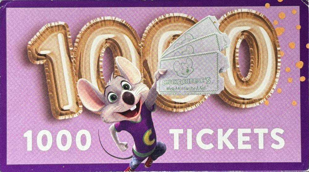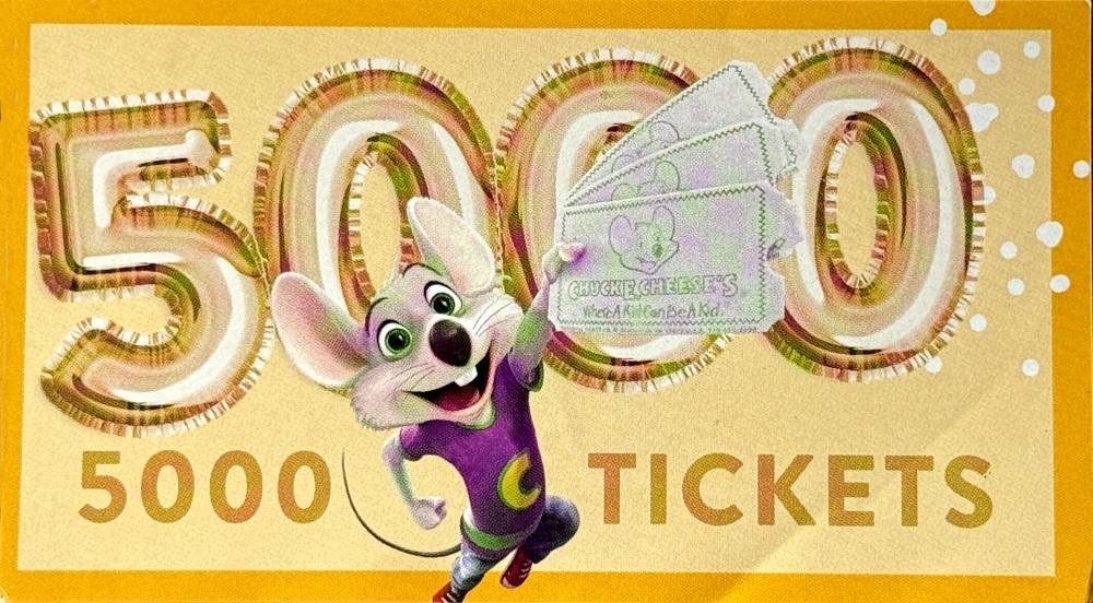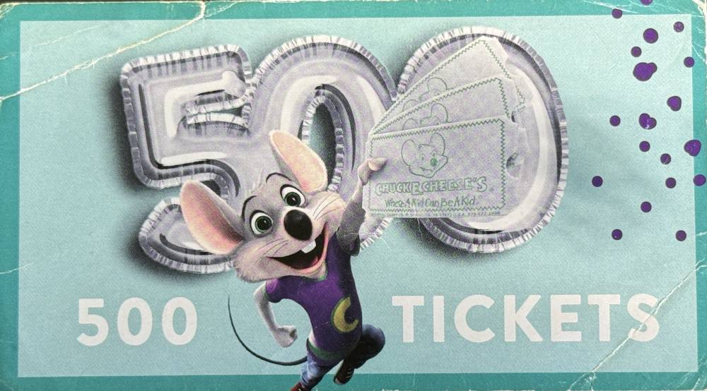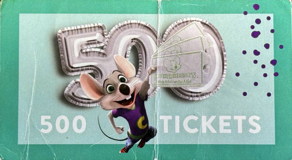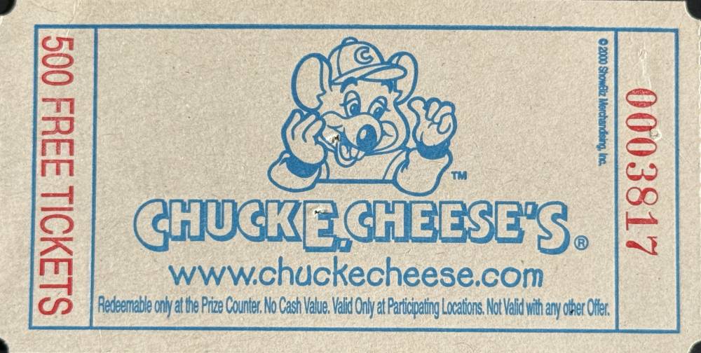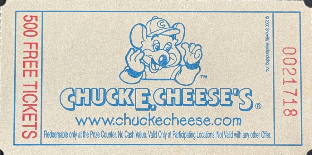 Front Text: Chuck E. Cheese's., Redeemable only at the prize counter., No cash value., Valid only at participating locations., Not valid with any other offer., www.chuckecheese.com, 500 Free tickets