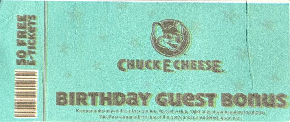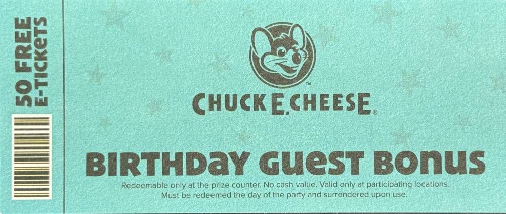 Front Text: 50 Free E-Tickets, Chuck E cheese Birthday Guest Bonus. Redeemable at the prize counter. No cash value, Valid at participating locations. Must be redeemed the day of the party and surrendered upon use.