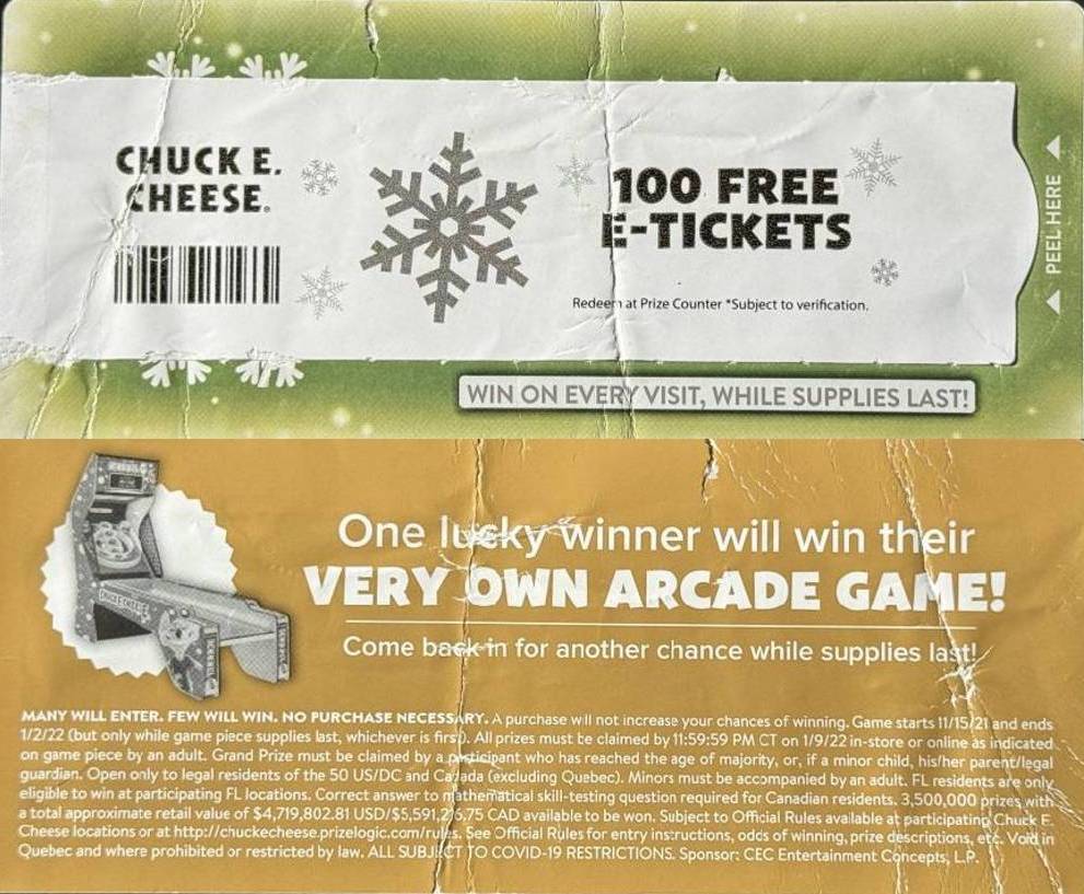 Front Text: 100 Free E-Tickets, Chuck E Cheese, Redeem at prize counter, Win on every visit, while supplies last.
