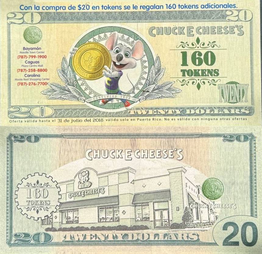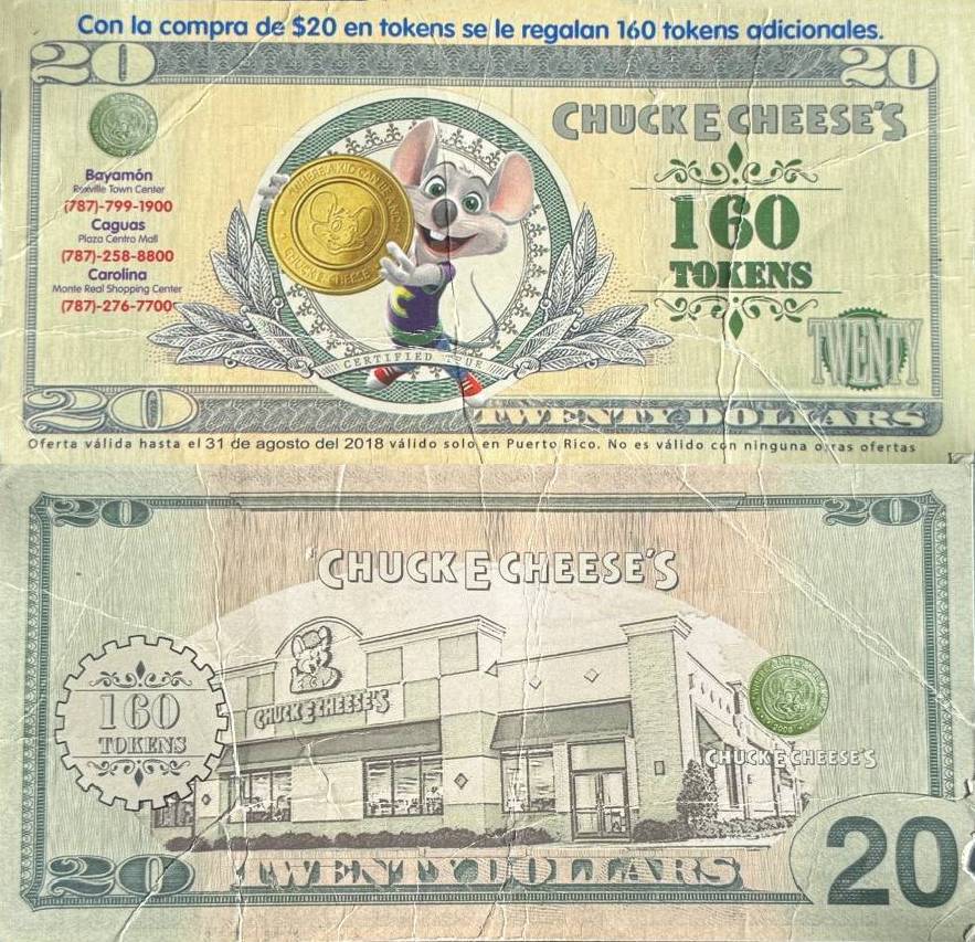 Back Text: Chuck E Cheese's, 160 Tokens, $20