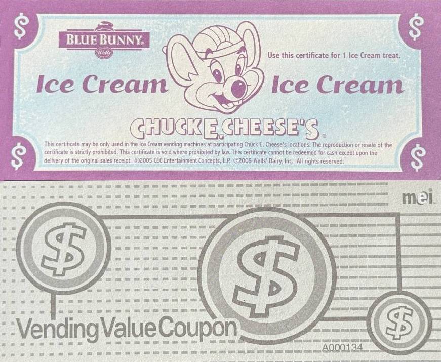 Front Text: Use this certificate for 1 free ice cream treat, Blue Bunny, Ice Cream, Chuck E Cheese's, This certificate may be only used in the Ice Cream vending machine at participating Chuck E Cheese's locations. The reproduction or resale of the certificate is strictly prohibited. This certificate is void where prohibited by law. This certificate cannot be redeemed for cash except upon the delivery of the original sales receipt. 2005 CEC Entertainment Concepts Lp, 2005 Well's Dairy Inc, All rights reserved.