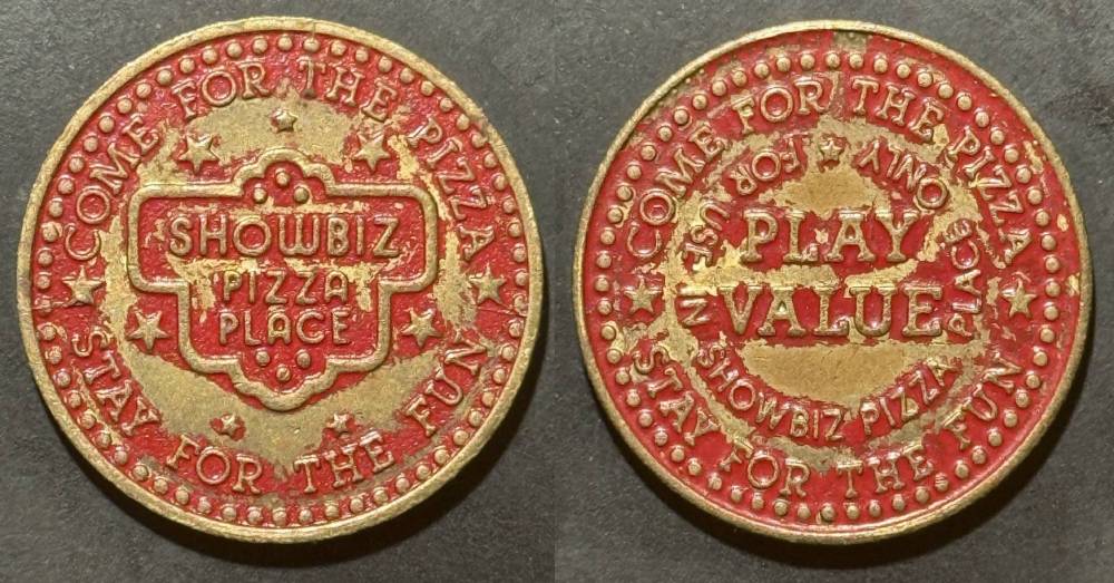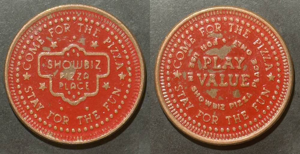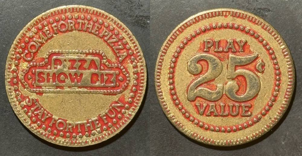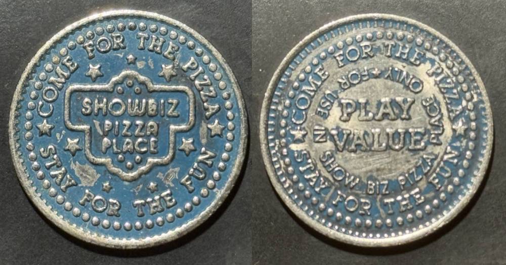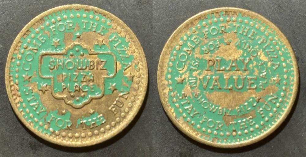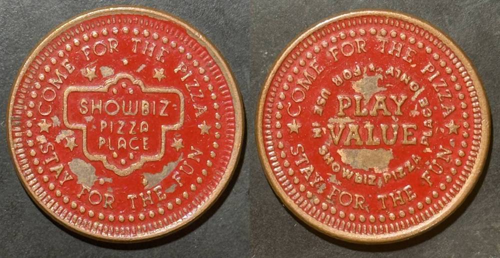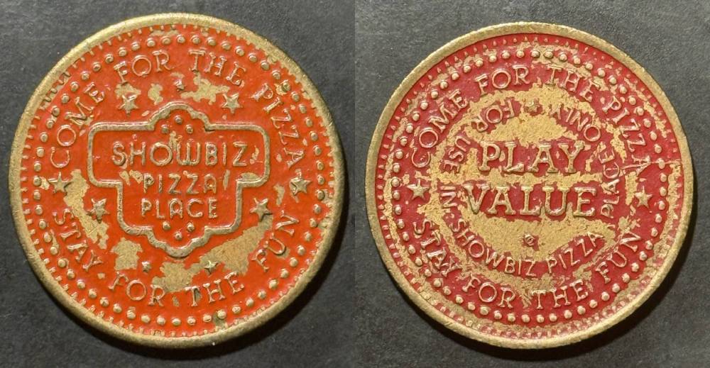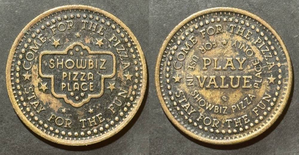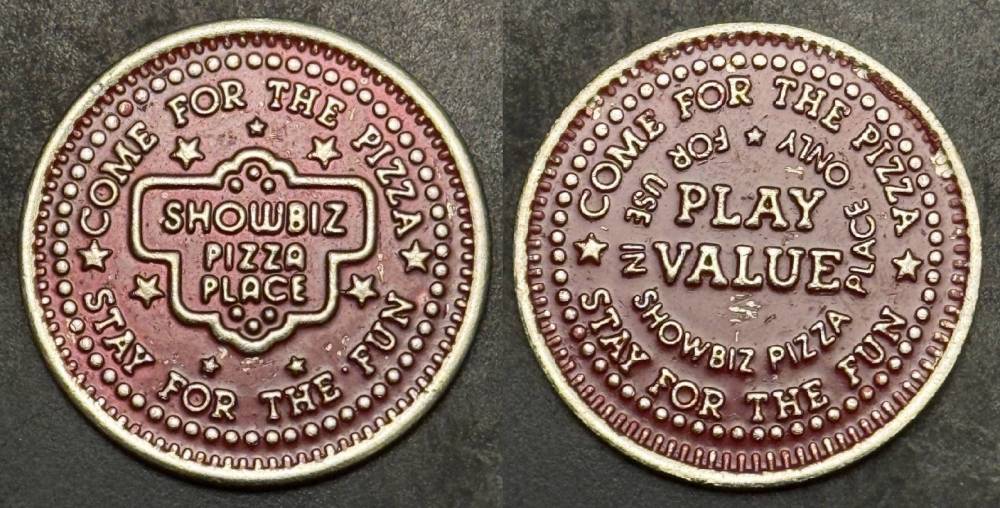 Variety- Long obverse denticles, small logo. Large letters "For Use in Showbiz Pizza Place"