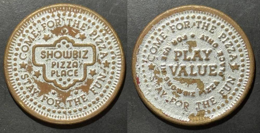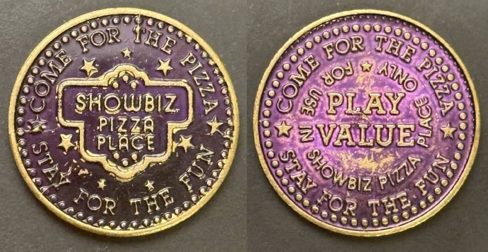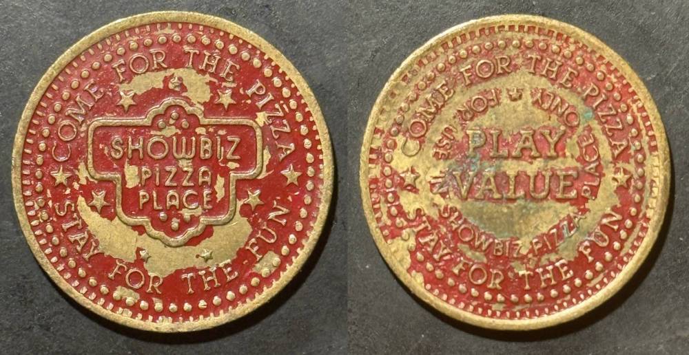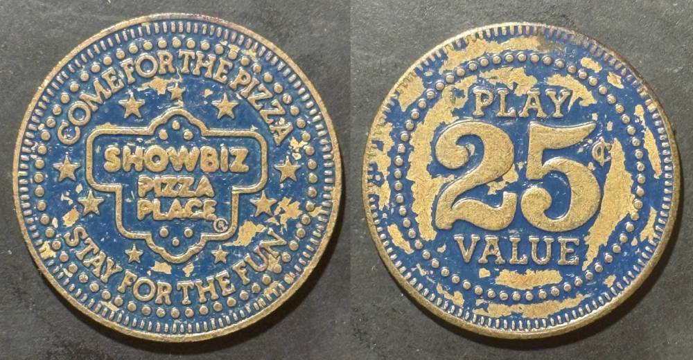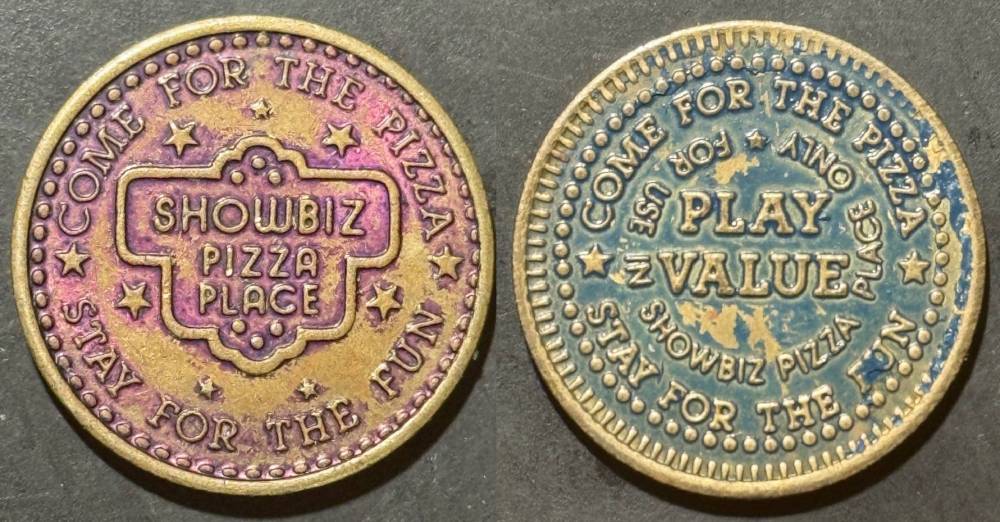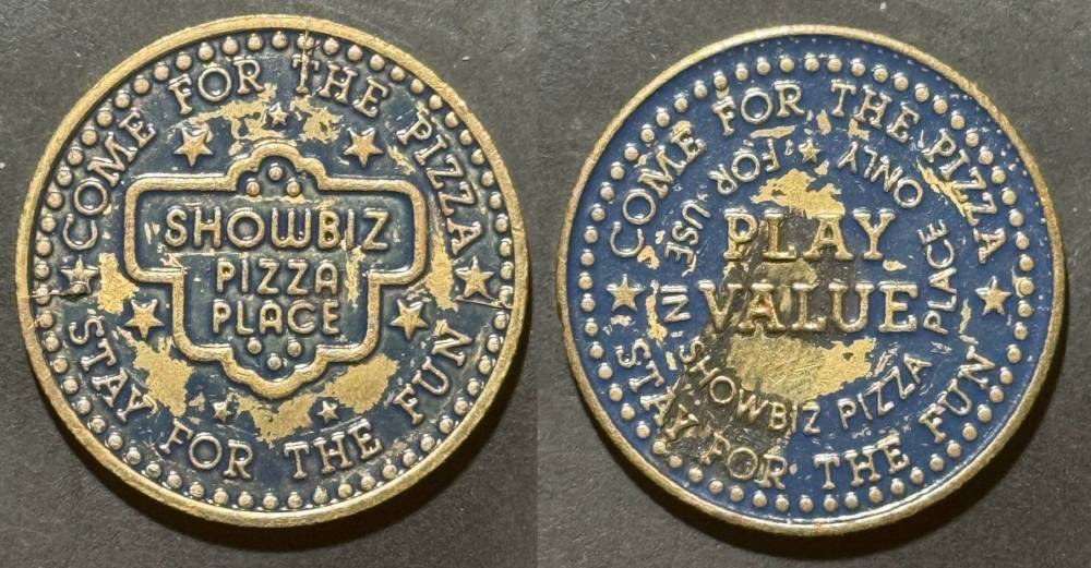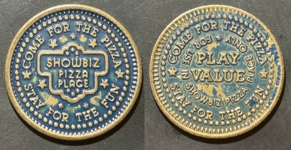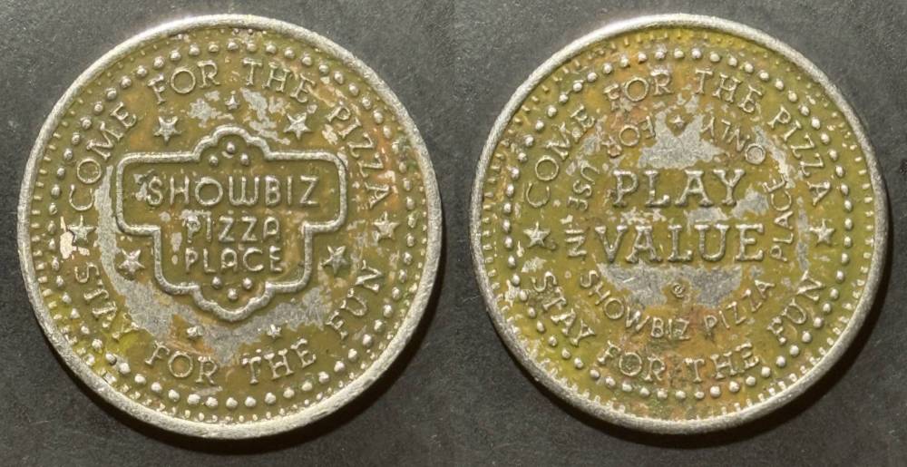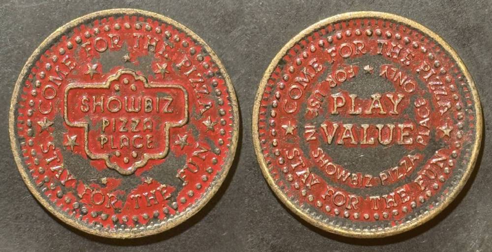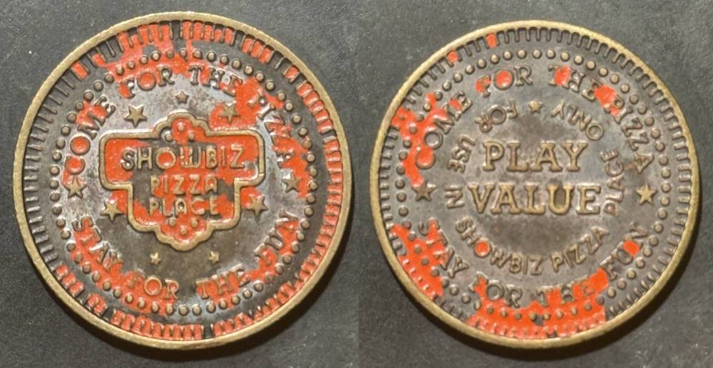 Variety- Long obverse denticles, small logo. Large letters "For Use in Showbiz Pizza Place"
