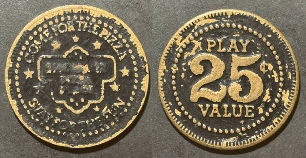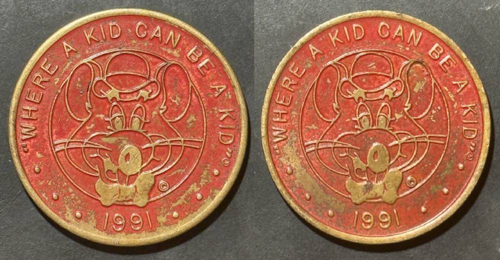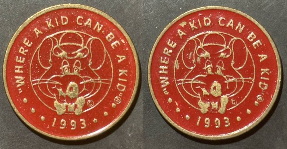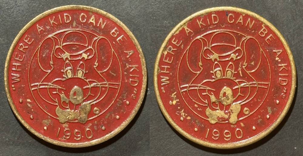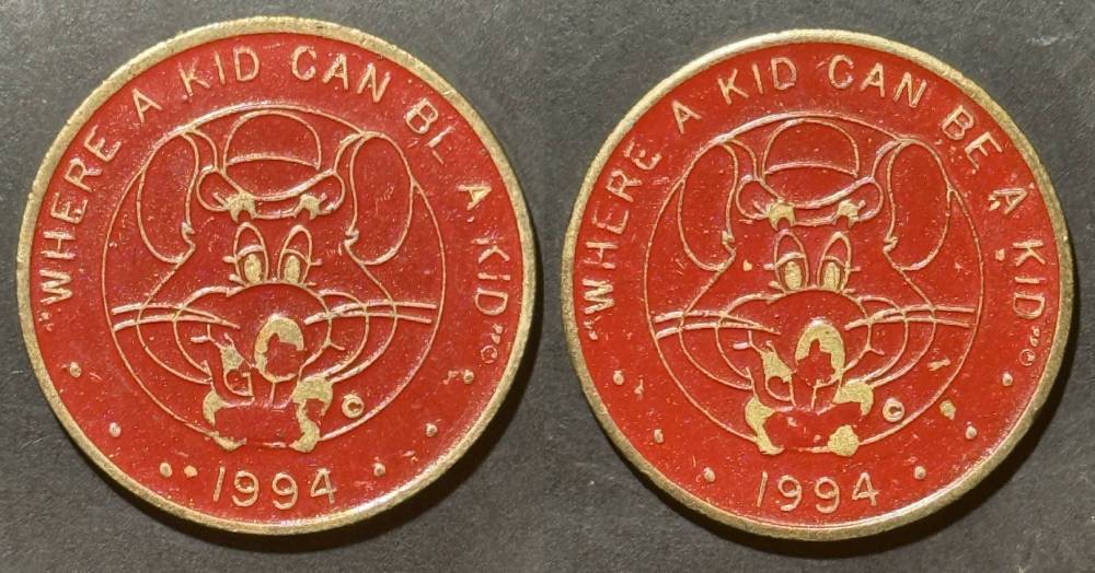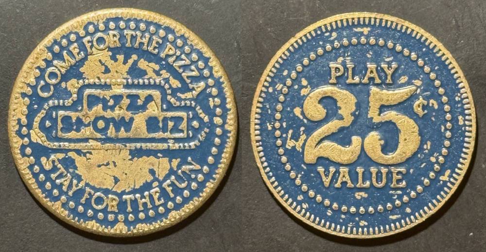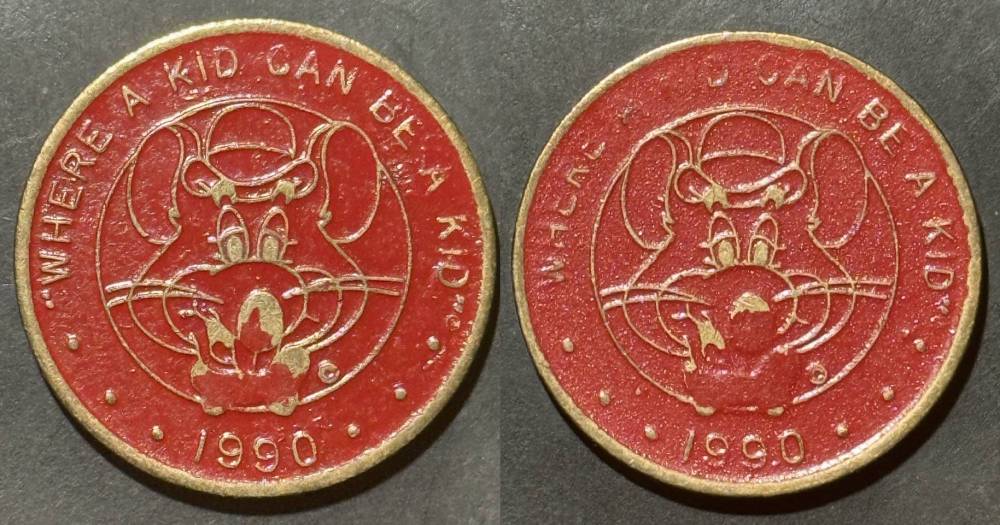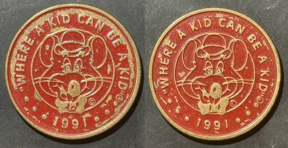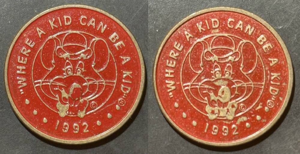 Variety- Long obverse denticles, small logo. Large letters "For Use in Showbiz Pizza Place"