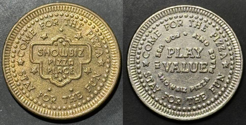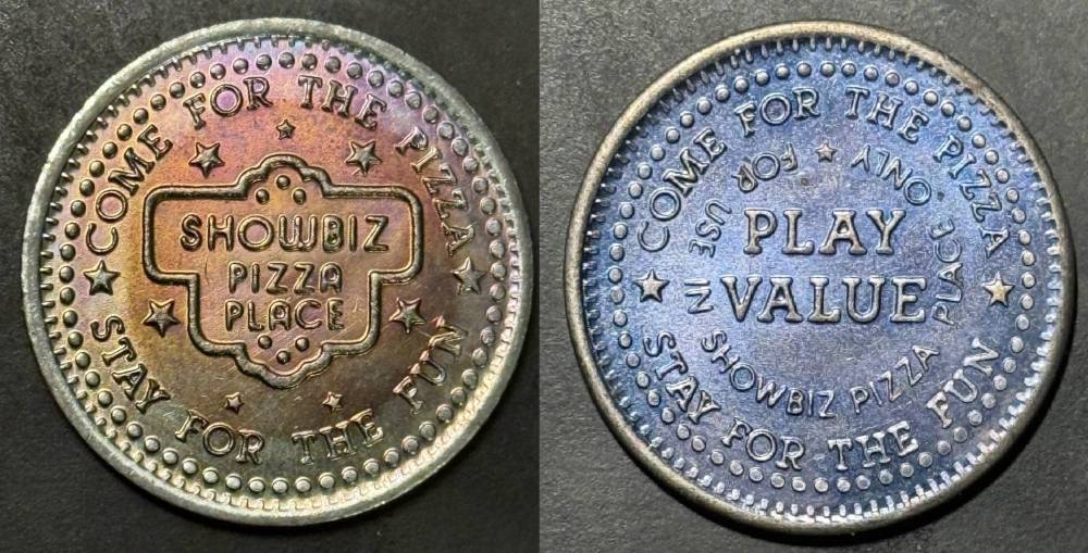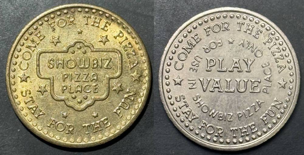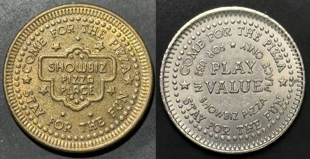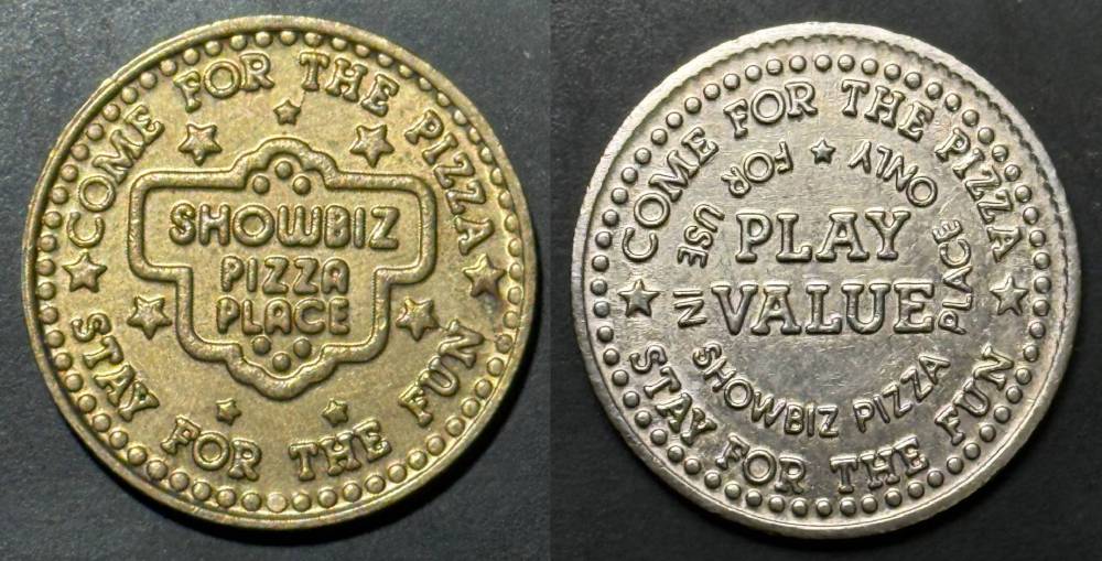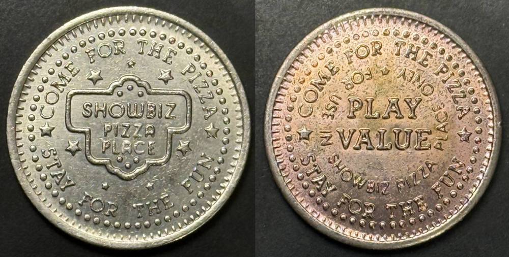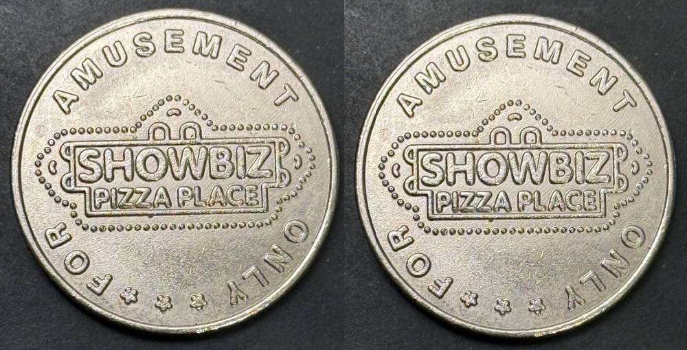 Variety- Long obverse denticles, small logo. Large letters "For Use in Showbiz Pizza Place"