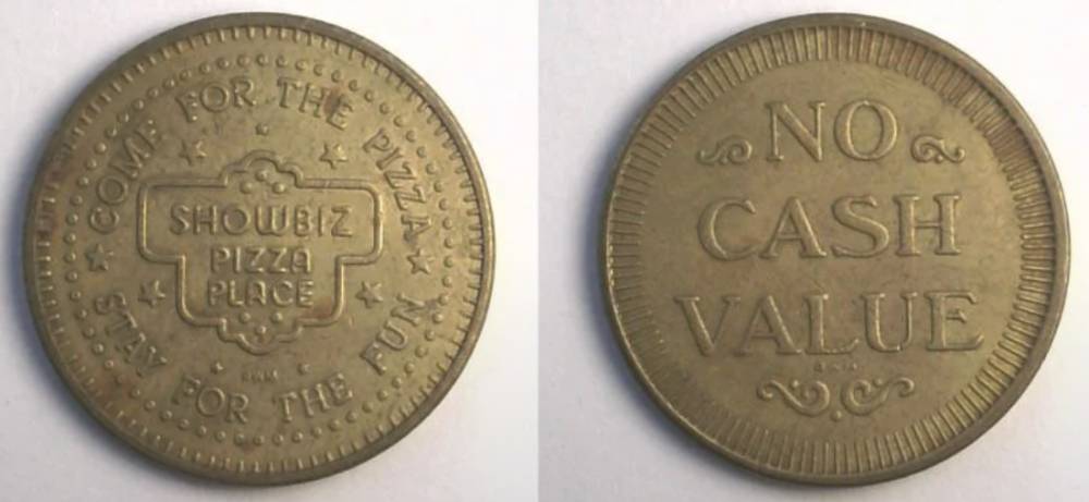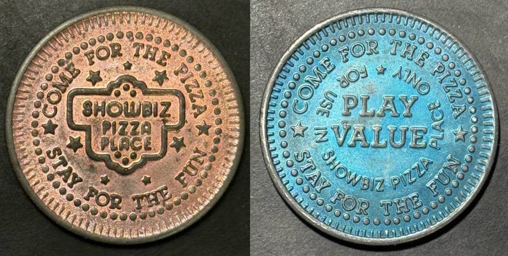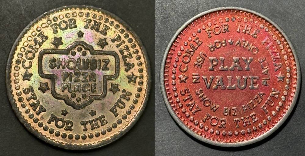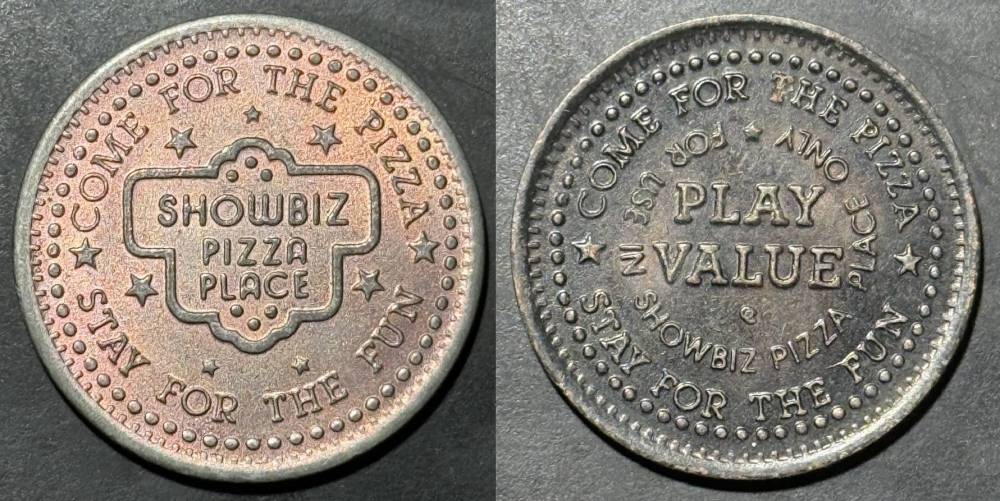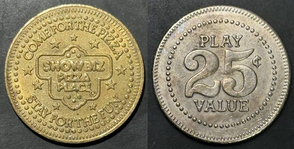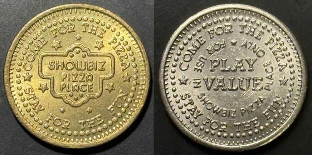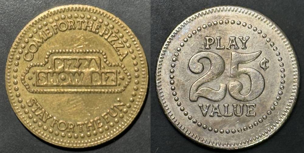 Variety- Long obverse denticles, small logo. Large letters "For Use in Showbiz Pizza Place"