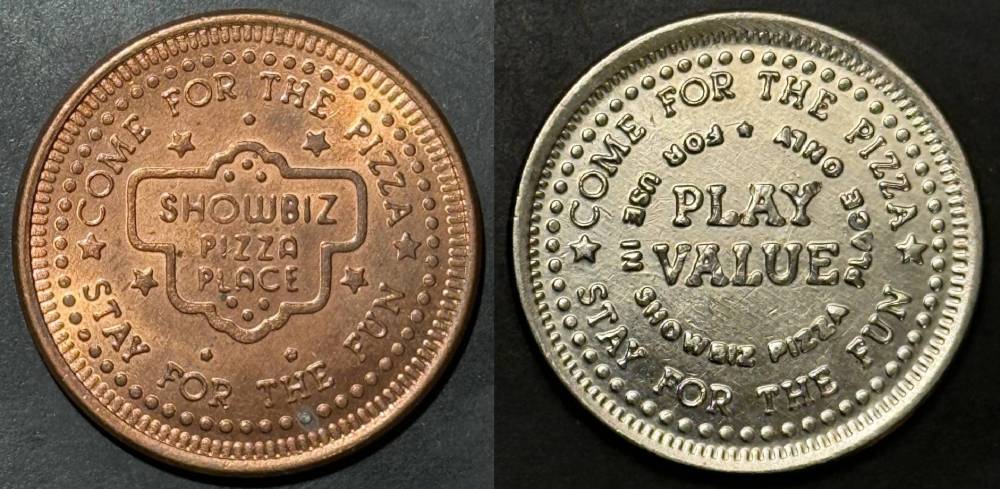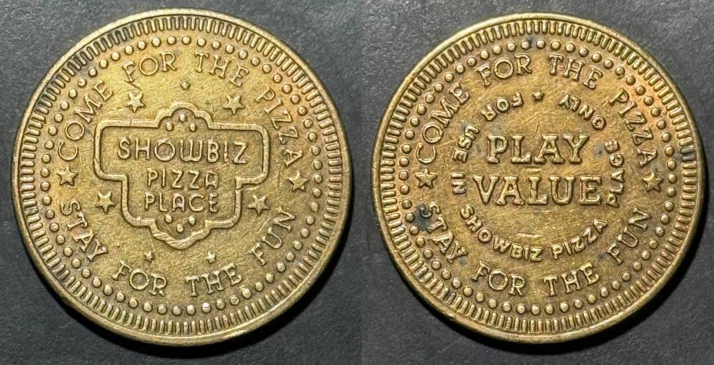 Obverse Text- Showbiz Pizza Place, Come for the pizza, Stay for the fun, RWM mintmark.
